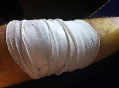 Sådan ser mit højre knæ ud lige nu. Torsdag opererede nogle meget dygtige læger lidt af min menisk. Det er faktisk en arbejdsskade, den menisk. Jeg faldt på trappen på Brøndby Stadion i november og har haltet noget siden. Nu er det fikset og forhåbentlig er jeg helt frisk og et par uger. Dejligt det endelig er ordnet og jeg har fundet ud af hvad det var der fik mig til at halte….